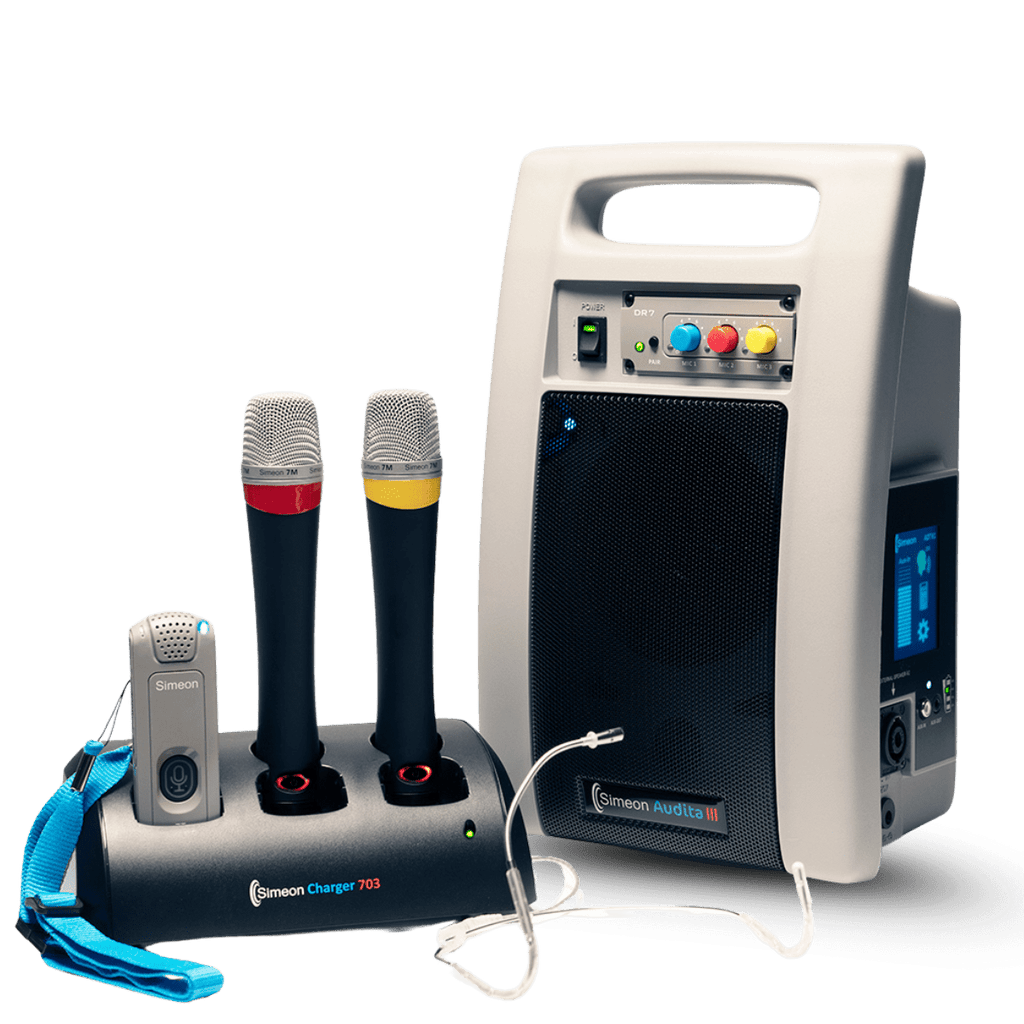 Compact, lightweight, and powerful, the Simeon Audita III is the first sound field system in USA to feature Auracas technology — allowing direct wireless streaming to Auracast-enabled hearing aids, cochlear implants, and other assistive devices.