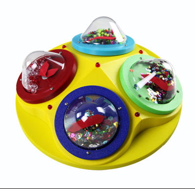 - Four total sensory centers that vibrate with brightly colored spinning glitter or beads
