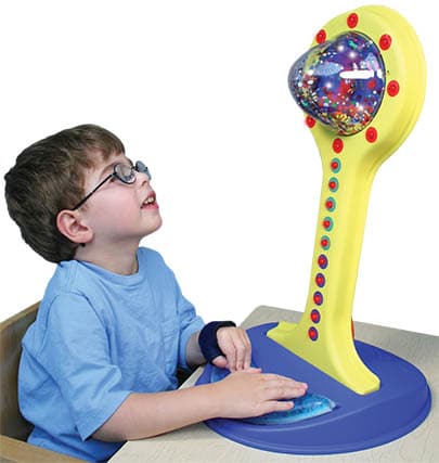 Multisensory entertainment reaches new heights with this motivating toy that recalls carnival strength-testing attractions. Strike the toy’s gushy pad and lights track upward indicating the force of the player’s strike and producing a corresponding sound effect. When struck with full force, players are rewarded with rainbow lights, vibration, music and spinning glitter! With adjustable activation pressure levels, this toy provides tactile, auditory and visual stimulation.