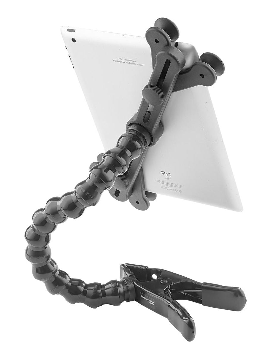 The ModularHose Tablet Holder Kit is a flexible solution for holding up a tablet where you need it. The adjustable single arm configuration allows the tablet to be positioned virtually anywhere. The adjustable tablet holder works with the Apple iPad, iPad Pro, and other tablets measuring diagonally up to 15" (381mm). Works in both landscape and portrait mode. Designed for tablets weighing 2 lbs or less. Each holder kit comes with: - 14" Adjustable Arm. - Adjustable tablet holder - Spring clamp that open up to 2" for desks, tables, treadmills, beds, wheelchairs, and much more. - Fully assembled and ready to use.