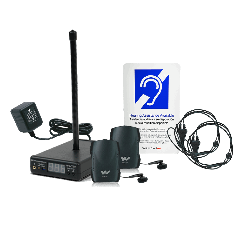 Meet Americans with Disabilities Act (ADA) requirements for assistive listening with this portable, economical FM personal listening system. The kit includes everything necessary to provide a straightforward plug-and-play assistive listening solution for venues accommodating up to 50 people.